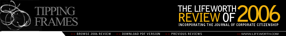 Balance is a state of equipoise; equal distribution of weight or amount. Work-life balance suggests "work" on one side and everything other than work, on the other. Ss they are separate something can't be both "work" and "life" at the same time. However, blending is to mix inseparably together. Whereas balance is the counterpoising of separate things, blending is the integration of those things.6 Work-life blending is key to tipping the frame of the nature of 'work'. It has enabled me to write this Review in a more personal and wide-ranging style than the usual academic, UN or corporate outlets I can use. Blogging often involves a work-life blend, including my own (www.jembendell.com). This blending relates also to the third reason why corporate responsibility events and networks are a site of frame tipping. They bring together people who have an interest in the state of the world, and who therefore have a strong social connection. Such people often meet in their leisure time, as illustrated by the growth of vibrant social-professional networks of people connecting on corporate responsibility around the world. From the one of the earliest social networks on this topic, CSR Chicks, which now has thousands of members, to "CSR Geneva", launched in mid 2006 and already with over 200 members who attend breakfasts, dinners and after-work drinks themed on different aspects of corporate responsibility, this area is extremely social. This reinforces the idea of our profession not being separate from our sense of self and allows discussions up, down and across hierarchies. It provides 'social proof' to people that they are part of a movement that sees and does business differently. Changing Frames in 2006 Changes in basic assumptions about the nature and purpose of business and work will have major knock on effects for the behaviour of consumers, staff, investors and regulators. The review discusses various examples of where cognitive frames in business, finance, accounting could be tipping: that certain assumptions about what those fields are, what they involve, and what it means to be professional within them is changing, in ways that have wide implications. Changes in the discourse around the financial services sector are particularly important. In the section 'Reframing Finance' we describe how a plethora of initiatives such as The Marathon Club, Enhanced Analytics Initiative (EAI) and UN Principles for Responsible Investment (UNPRI) are together helping reshape what finance professionals understand as being material and relevant to ones fiduciary duty. Also important is the emergence of a positive connotation to the environmental challenge of consumption. In the section 'Consuming Truths' we describe how finding new pathways for social development that are sufficiently resource-light to be possible for a majority of the world's population over the long term, rather than the minority of a few generations of middle- to upper-class consumers, is a pro-poor vision. In the sections 'Who's Leading Hu' and 'A Different Path' we describe how new visions of sustainable development are arising in China and India. With the right leadership, development need not depend on risks such as cheap oil, inequalities such as poor pay and conditions, and the disruption of rural communities' livelihoods. As Rajesh Sehgal, Senior Law & Policy Officer at WWF-India explains, "Indian companies can become leading exporters of and investors in sustainable goods and services, whilst emerging as key actors in promoting a proactive international sustainable development agenda." Whether this will lead to a tipping point in the way Asian nations generally view and pursue 'development' is currently unknown. A counter process of reframing has been underway for sometime, with the shift to individualism and materialism most clearly illustrated in 2006 by the economic boom in Vietnam, described in the section 'Capitalism's Rising Star'. The environmental and social strains of economic booms across Asia could bring things to a grinding halt, as warned by Mira Kamdar in her book 'Planet India'. 7 The implications for corporate citizenship are that companies and investors need to assess how they are helping or hindering the right frameworks and incentives for innovation and delivery of the business models needed in a resource-constrained future. Rather than doing business as usual, with some social and environmental improvements, the scale, urgency and depth of the sustainability challenge requires companies to engage with other actors in society to promote governance for sustainability. In the recent past progressive people in business, government and civil society have been uncomfortable about the ethics of 'social engineering' public values. This is because it seems to go against the spirit of recognizing people's dignity as equal people, which underlies democracy and human rights. That is a huge mistake. We are all socially conditioned. Every year billions are spent on marketing advertisements, public relations and lobbying. This is done to influence people to spend money. In doing so they feed frames such as desire, status and materialism. It is because we have left compelling mass communications to institutions that pursue narrow self-interests that we have the public attitudes we see today. The challenge is to help make people conscious of the social conditioning processes, to reduce those that are damaging, and to promote those that are beneficial to people within their communities. Consequently some organizations, such as WWF, have been calling on companies to 'talk the walk', by using their communications functions of advertising, public relations, lobbying and investor relations to articulate the type of economy and society we need, and the innovations in public policy we need to get there. From Environmentalism to Societal Growth